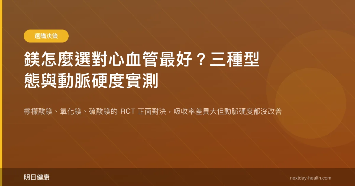 動脈硬度是指動脈壁彈性下降、變得僵硬的狀態,是心血管疾病的獨立預測因子。許多人補鎂時會問:「哪種鎂對心血管最好?」2022 年一項嚴謹的隨機對照試驗(RCT)給出了出人意料的答案——三種常見鎂型態都沒有改善動脈硬度,但吸收率確實有差異。這篇指南帶你用三步驟,根據實際證據做出選擇。
