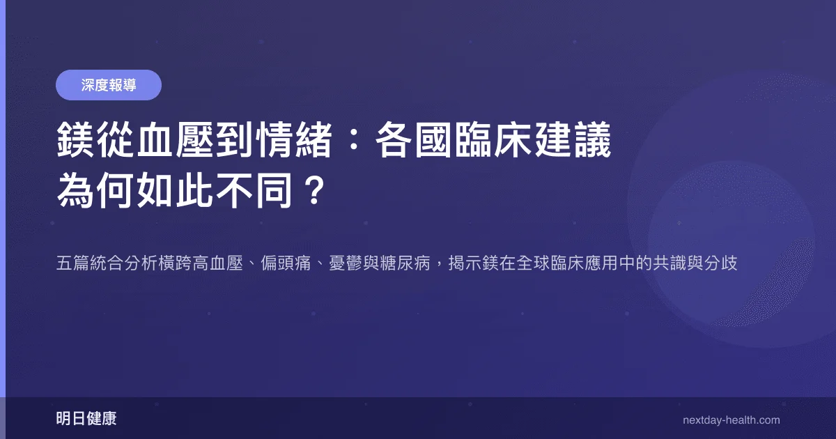 鎂是人體內參與超過 300 種酶促反應的必需礦物質,從能量代謝到神經傳導均不可或缺。鎂缺乏(hypomagnesemia)是指血清鎂濃度低於 0.75 mmol/L 的狀態,可能影響血壓調節、神經功能與胰島素敏感性。近年五篇高品質統合分析不約而同聚焦鎂的臨床效益,涵蓋高血壓、偏頭痛、憂鬱、焦慮與糖尿病,其中浮現一個核心問題:各國的臨床建議為何存在顯著差異?