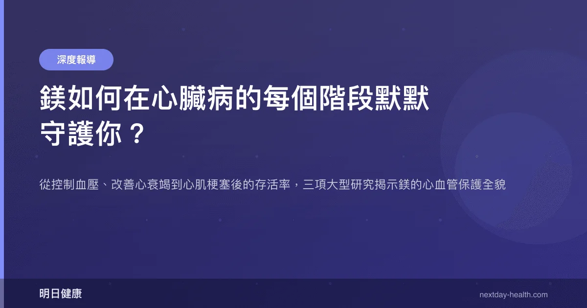 回家之後我開始查資料,結果發現這幾年關於鎂與心臟健康的研究數量驚人,而且研究的格局不只是「降血壓」這麼單純。從預防、治療到重大心臟事件之後的照護,鎂都出現在不同的研究場景裡。今天,我想把這些拼圖拼在一起,帶你看看鎂在心臟病不同階段扮演的角色。