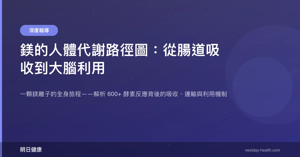 這篇報導將沿著一顆鎂離子的旅程,拆解它在人體內的完整代謝路徑。理解這條路徑,不只是學術上的好奇心,更是判斷「該補什麼型態的鎂」「為什麼抽血正常卻可能缺鎂」等實際問題的科學基礎。