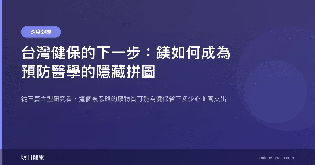 台灣健保是全世界公認的優秀制度,但它長期面臨的挑戰是「治療支出遠大於預防投資」。當一項統合分析告訴我們每天 300 mg 鎂就能輔助降壓,當世代研究顯示充足鎂攝取與心血管死亡風險降低 28% 相關,當次分析發現鎂影響新藥療效——我認為這些累積的證據,值得健保政策制定者認真看一眼。