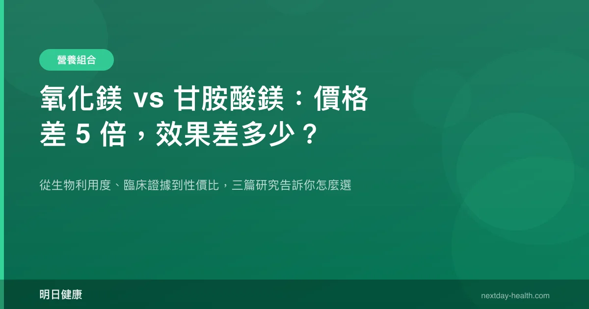 以台灣市售鎂補充劑的常見價格帶估算,氧化鎂每月費用約 50-100 元,甘胺酸鎂則約 300-500 元,價差確實可達 3-5 倍。但從「每毫克實際吸收鎂」的角度計算,兩者的成本差距大幅縮小。
