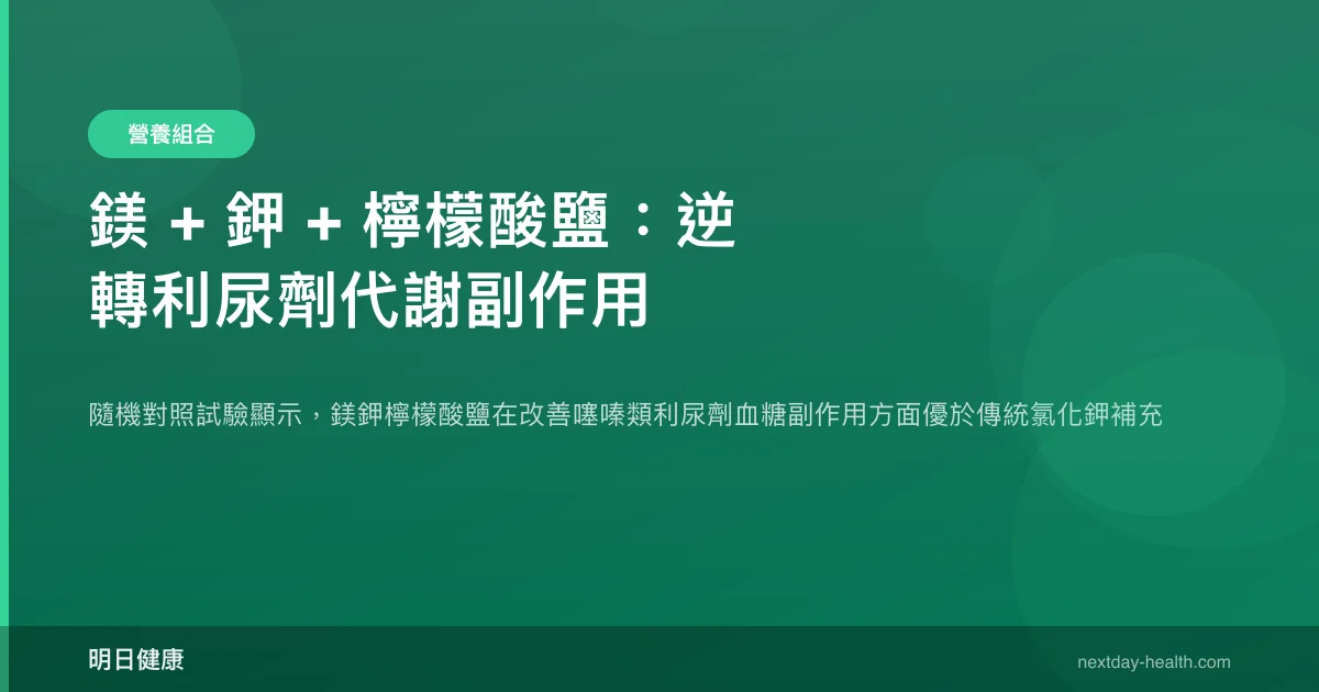 在利尿劑使用的情境下,這個問題尤為突出。噻嗪類利尿劑透過抑制遠曲小管的鈉氯共轉運蛋白來促進排鈉利尿,但同時也增加了鎂與鉀的腎臟排泄。當兩種參與胰島素訊號傳遞的關鍵礦物質同時流失,血糖失調的風險自然上升。Vongpatanasin 等人的研究正是基於這個病理生理機制,提出了同時補充鎂與鉀的策略。