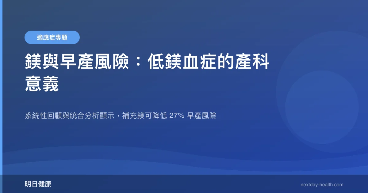 統合分析顯示,補充鎂的孕婦早產風險降低 27%(RR = 0.73, 95% CI: 0.57–0.93),這項發現來自涵蓋生態學、觀察性與介入性研究的系統性回顧。在產科門診中,鎂的營養狀態經常被忽略,但它可能是影響妊娠結局的關鍵礦物質之一。