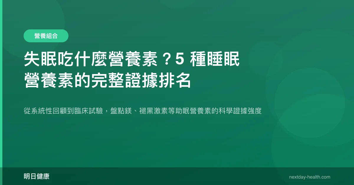 系統性回顧與統合分析顯示,鎂補充可縮短入睡潛伏期約 17 分鐘,且在老年族群中改善主觀睡眠品質的趨勢一致(PMID: 33865376)。面對失眠,許多人第一時間想到安眠藥,但營養素介入正成為睡眠醫學的重要研究方向。本文依據現有臨床證據,為五種常見助眠營養素進行證據強度排名,幫助讀者做出更有依據的選擇。