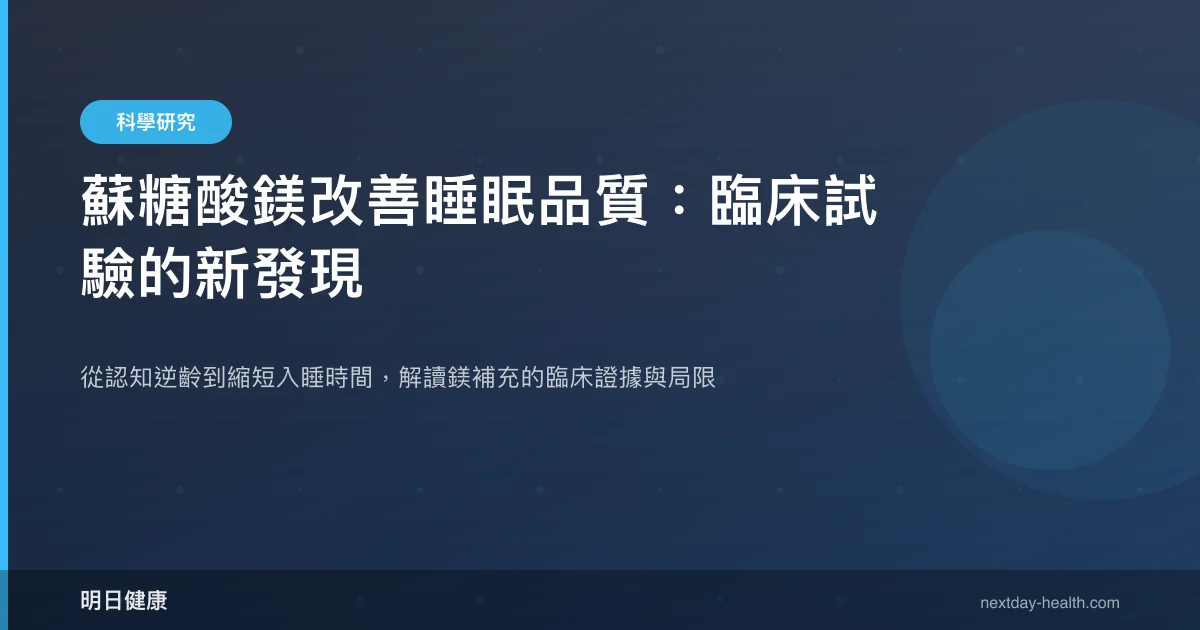 其次,Liu 等人的 RCT 主要研究終點是認知功能而非睡眠,睡眠相關改善屬於次要觀察或間接推論。目前尚缺乏專門針對蘇糖酸鎂與睡眠品質的大型隨機對照試驗。