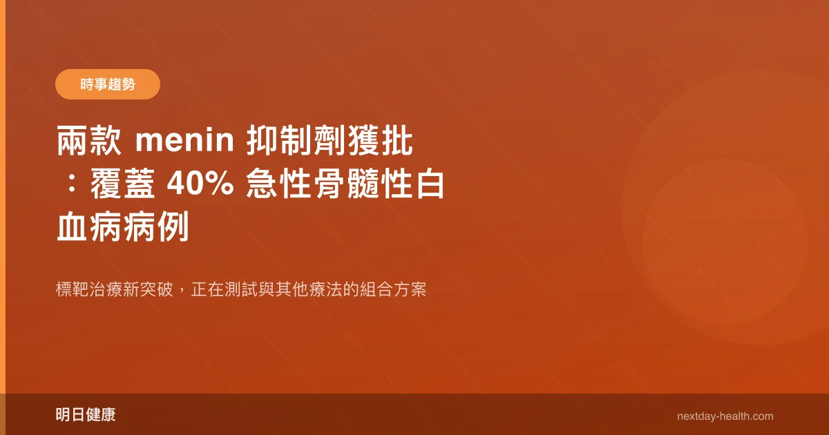兩款針對 menin 蛋白的標靶藥物近期獲得 FDA 核准,適用於約 40% 的急性骨髓性白血病(AML)病例。這類藥物標誌著 AML 治療從廣譜化療邁向精準標靶的重要里程碑。
