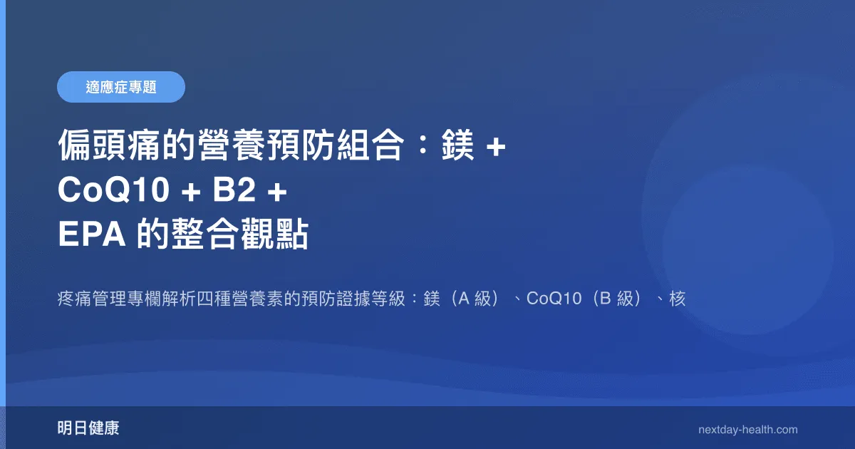 偏頭痛是一種多因子疾病,它的觸發涉及神經興奮性、粒線體功能、血管反應性、發炎反應和離子通道——沒有任何單一介入可以覆蓋所有面向。這正是為什麼「組合策略」比「單一彈藥」更合理。