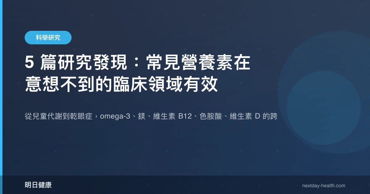 一項涵蓋兒童肥胖族群的網絡統合分析顯示,在六類營養補充品中,長鏈 omega-3 脂肪酸對三酸甘油酯的改善效果排名第二,僅次於左旋肉鹼(PMID: 41769658)。與此同時,鎂、維生素 B12、色胺酸、維生素 D 等常見營養素也在各自的臨床試驗中展現了超越傳統認知的應用價值。這五篇研究橫跨代謝、心血管、眼科與睡眠醫學四大領域,為臨床營養學提供了跨領域的實證參考。