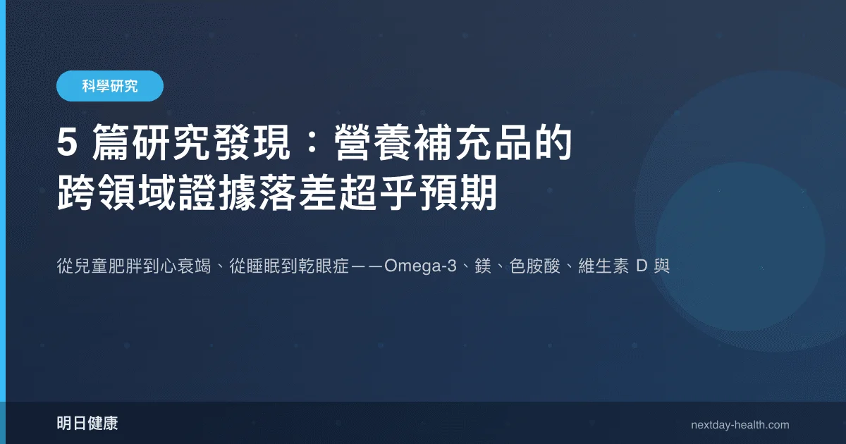 一篇 2026 年發表於 Frontiers in Nutrition 的網絡統合分析,比較了多種營養補充品對兒童肥胖代謝指標的影響:左旋肉鹼在體重、BMI、腰圍、空腹血糖、HOMA-IR 及 LDL 膽固醇六項指標上均達統計顯著,而長鏈 Omega-3 脂肪酸僅展現中度效益,主要反映在三酸甘油酯的降低(PMID: 41769658)。這項結果揭示了一個常被忽略的事實——即便同屬「營養補充品」,不同成分在不同臨床情境下的證據強度差異極大。本文彙整五篇橫跨代謝、心血管、睡眠與眼科領域的臨床研究,從 A 級統合分析到 B 級觀察性研究,拆解 Omega-3、鎂、色胺酸、維生素 D 與 B12 目前的實證全貌。