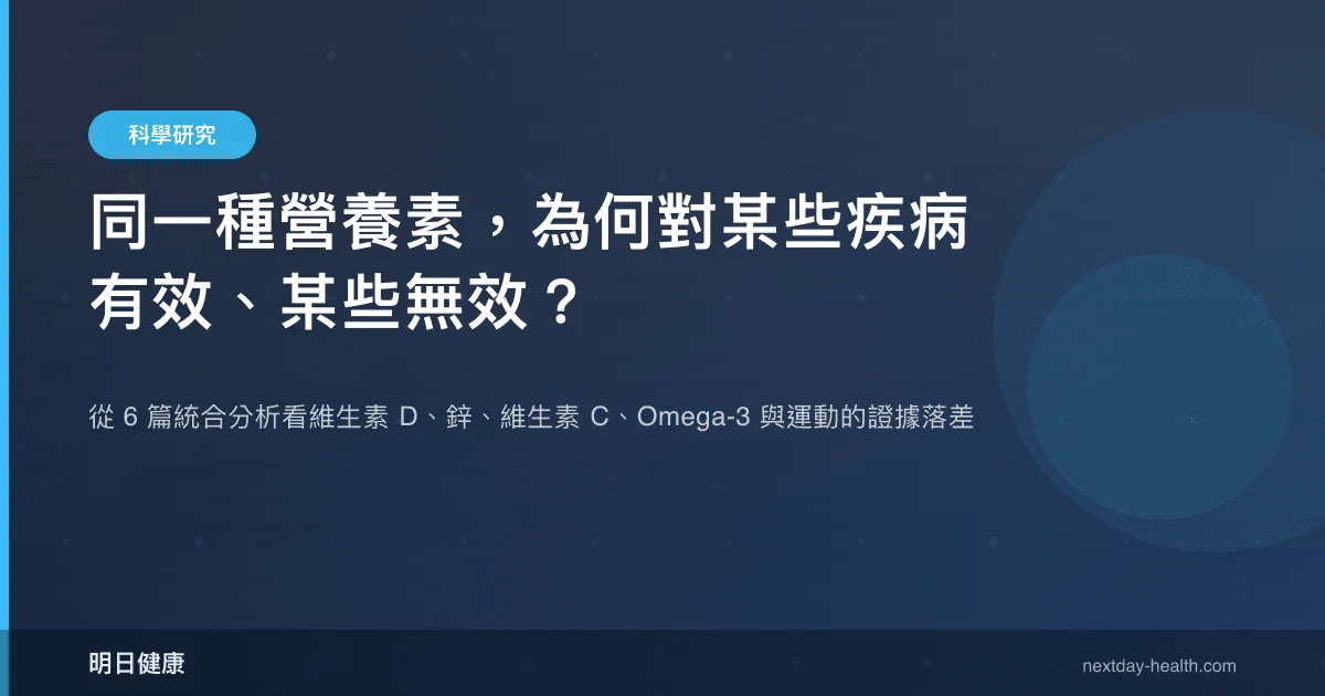 證據落差是指同一種營養素在不同健康結局中所累積的研究證據強度存在顯著差異,反映出疾病機轉、生物利用度與研究設計的交互影響。本文彙整 6 篇近期發表的統合分析與系統性回顧,涵蓋維生素 D、鋅、維生素 C、Omega-3 與運動五個主題,從數據層面解析這種落差的成因與臨床意義。