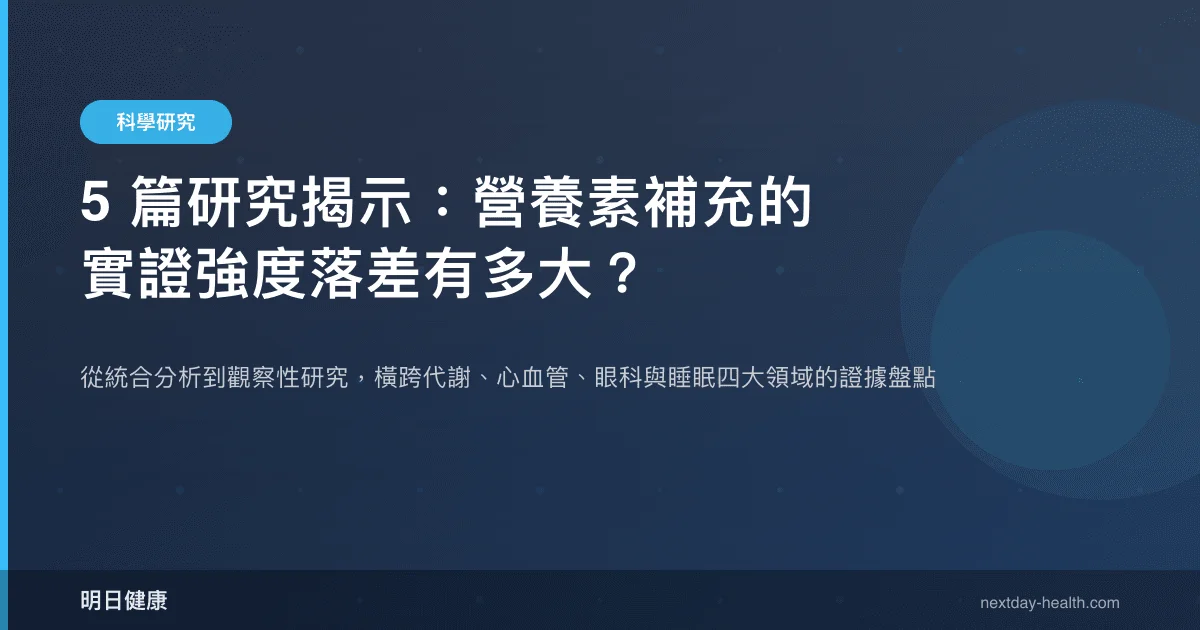 本文彙整 5 篇涵蓋 Omega-3 脂肪酸、鎂、維生素 B12、色胺酸與維生素 D 的最新研究,橫跨代謝、心血管、眼科與睡眠四大領域,嘗試呈現營養素實證的完整光譜——從 A 級統合分析到 B 級觀察性數據,從多指標顯著改善到有限效益。