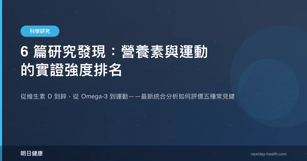 6 篇涵蓋統合分析與隨機對照試驗的最新研究,針對五種常見健康介入——維生素 D、鋅、維生素 C、Omega-3 脂肪酸與運動——提供了強度不一的臨床證據。其中部分介入展現強勁正面結果,部分則呈現陰性發現,這正是實證醫學的常態:並非每種營養素都對每種健康問題有效。以下逐一檢視各項介入的證據等級與適用範圍。