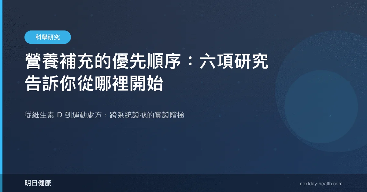 維生素 D、鋅、維生素 C、Omega-3 與運動——這五項常見的健康介入各自擁有不同強度的臨床證據。當消費者面對琳瑯滿目的補充品時,真正的問題不是「要不要補」,而是「先補哪一個、後加哪一個」。本文彙整六項近年大型統合分析與系統性回顧,嘗試建構一套以證據強度為基礎的「營養階梯」,協助讀者理解不同營養素在各身體系統中的實證定位。