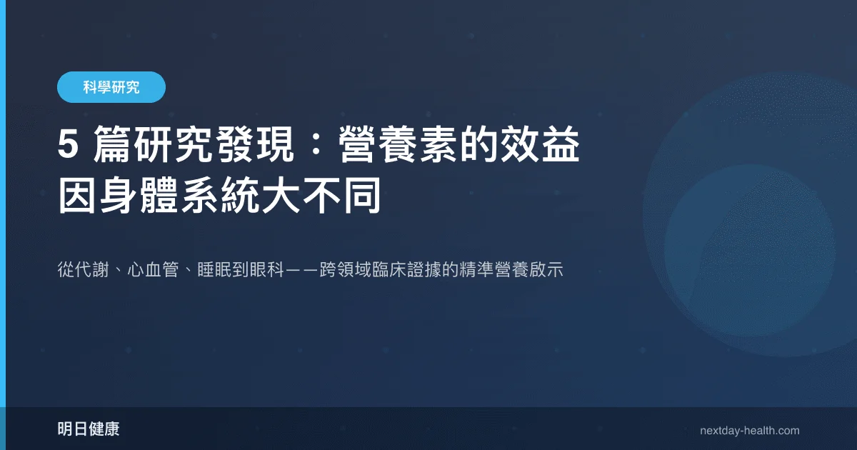 近年營養學研究正從「單一營養素對單一疾病」的線性思維,轉向探討營養素在不同身體系統中的差異化效應。精準營養(precision nutrition)是指根據個體的生理狀態、疾病背景與生物標記,選擇最適合的營養介入策略。本文彙整 5 篇橫跨代謝、心血管、睡眠與眼科領域的臨床研究,解析色胺酸、Omega-3、鎂、維生素 D 與 B12 各自的最佳適應場景,以及證據強度的差異。
