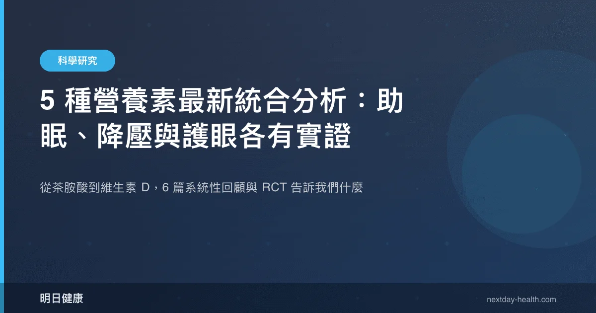 營養補充品研究在過去兩年快速累積新證據,但不同營養素的適用場景與證據強度差異懸殊。本文整理 6 篇最新系統性回顧與臨床試驗,涵蓋茶胺酸(L-Theanine)、鎂、Omega-3、維生素 D 與維生素 B12,依「睡眠→血壓→眼睛健康→體重代謝」四個健康面向逐一檢視實證等級,幫助讀者判斷哪些營養素值得優先關注。