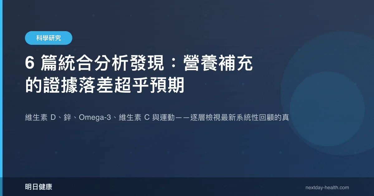 營養補充劑市場年產值逾千億美元,消費者面對的健康宣稱繁多,但系統性回顧與統合分析所呈現的圖像往往比廣告溫和許多。「證據階梯」是指依據研究設計品質與結果一致性,將健康介入措施從「觀察性關聯」排列至「高確定性因果推論」的分級架構。本文彙整 6 篇近兩年發表的統合分析與系統性回顧,涵蓋維生素 D、鋅、Omega-3、維生素 C 及運動等五大領域,逐層呈現各介入措施的實際效益與研究侷限,協助讀者建立以證據為基礎的營養決策。