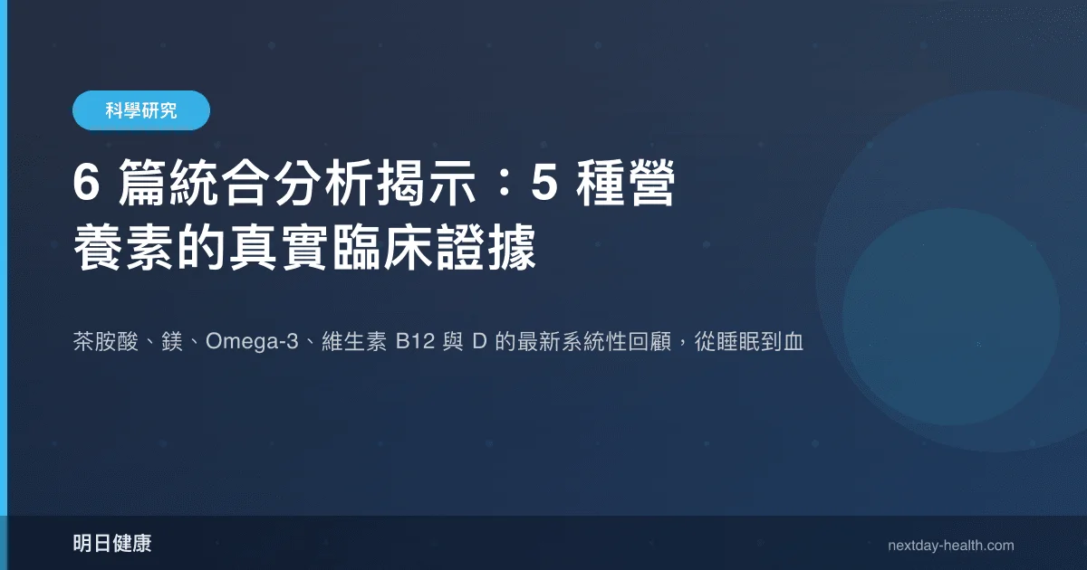 過去兩年間,針對常見營養補充劑的系統性回顧與統合分析密集發表,為臨床決策提供了更高層級的證據。本文彙整 6 篇涵蓋茶胺酸、鎂、Omega-3、維生素 B12 及維生素 D 的最新研究,逐一檢視其效果量、適用族群與研究限制,協助讀者區分「有統合分析支持」與「僅有初步觀察」的差距。