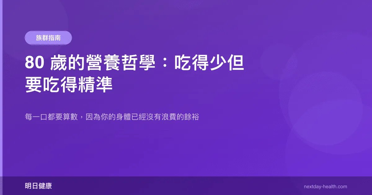 這不是你的問題,這是身體正常的老化變化。但這個變化帶來了一個嚴肅的挑戰:當你能吃的總量越來越少,每一口食物的「營養效率」就變得越來越重要。你不能再用年輕時的方式吃東西——大量吃、隨便吃,反正身體自己會把需要的營養素挑出來。八十歲的營養哲學只有一個核心原則:吃得少,但要吃得精準。