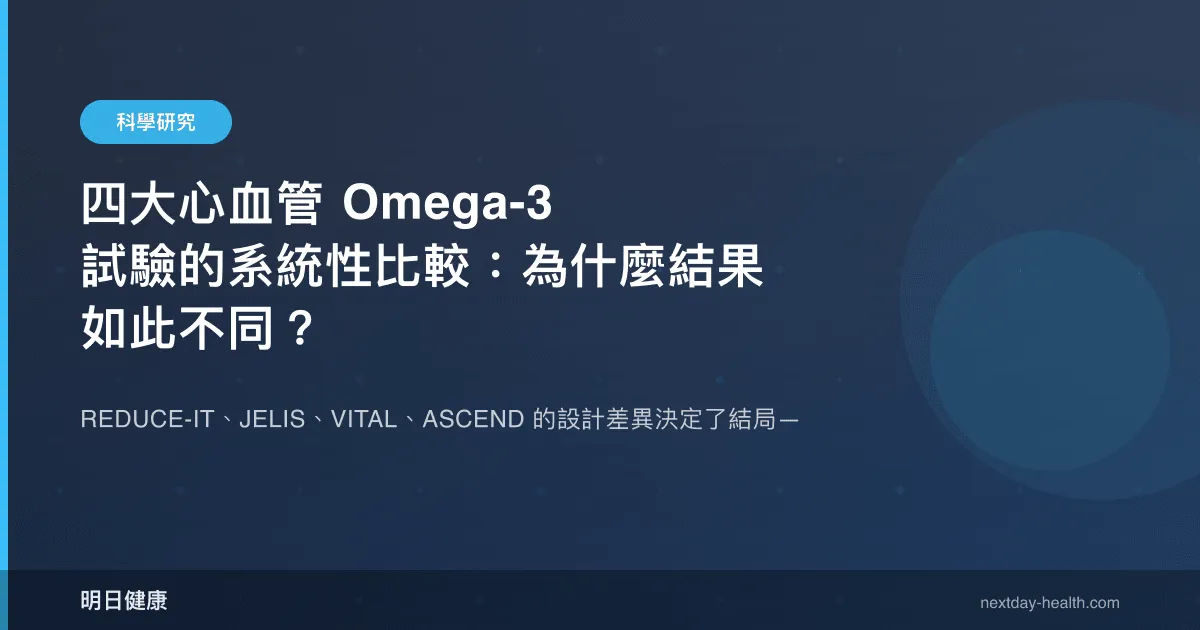 Omega-3 脂肪酸在心血管預防領域的臨床證據堪稱醫學研究中最具爭議性的議題之一。四項大型隨機對照試驗——REDUCE-IT(Bhatt 2019, PMID: 30415628)、JELIS(Yokoyama 2007, PMID: 17398308)、VITAL(Manson 2019, PMID: 30415637)、ASCEND(Bowman 2018, PMID: 30146931)——在設計上看似都在回答同一個問題「Omega-3 能否降低心血管事件?」,但結果卻截然分歧:REDUCE-IT 與 JELIS 顯示顯著保護效果,VITAL 與 ASCEND 則為中性結果。這種看似矛盾的證據格局,實際上揭示了精準營養醫學的核心邏輯——「什麼成分」、「多大劑量」、「給什麼人」這三個維度的組合,才是決定臨床結局的真正關鍵。