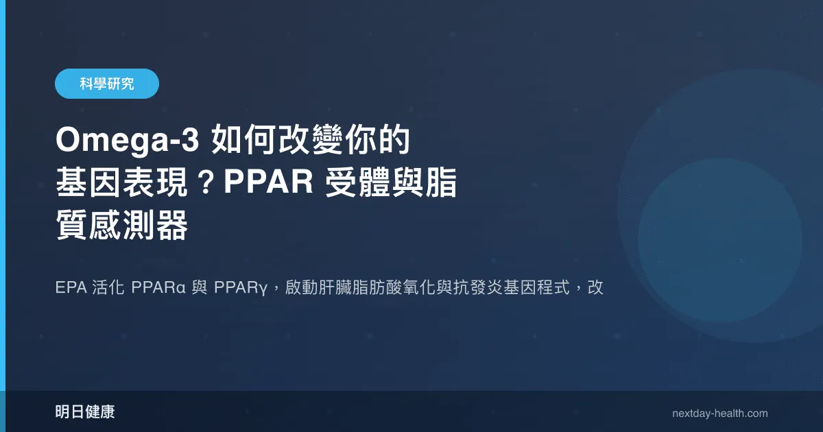 Omega-3 脂肪酸的健康效益遠不止於細胞膜組成或抗發炎代謝物的生成。過去二十年的分子生物學研究揭示,EPA 和 DHA 可以直接進入細胞核,作為核受體的配體(ligand),重新編程數百個基因的轉錄活性。這些核受體中最重要的家族就是過氧化體增殖物活化受體(Peroxisome Proliferator-Activated Receptors, PPARs)——一組被稱為「脂質感測器」的轉錄因子。本文深入解析 PPAR 的三種亞型如何感測 Omega-3 訊號,以及這如何轉化為抗發炎、代謝改善和胰島素敏感性提升的下游效應。