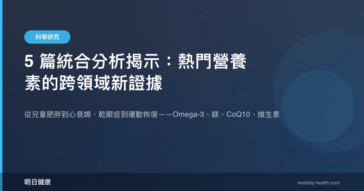五種常見營養素——Omega-3 脂肪酸、輔酶 Q10(CoQ10)、維生素 D、鎂與膳食纖維——近年在各自傳統適應領域之外累積了新的臨床證據。本文彙整五篇最新統合分析與隨機對照試驗,以證據等級為軸線,逐一檢視這些營養素在非典型領域的效果量與研究限制,協助讀者理解哪些發現已具臨床參考價值,哪些仍需謹慎詮釋。