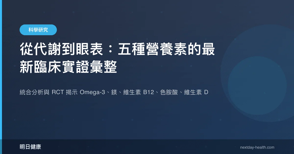 跨系統效應是指同一種營養素在不同器官或生理路徑中展現的多重生物活性。過去十年,臨床試驗設計從單一終點逐步擴展至多系統觀察,使研究者得以捕捉營養素在代謝、心血管、神經與眼表等領域的廣泛影響。本文彙整五項最新臨床研究——涵蓋統合分析、隨機對照試驗與觀察性研究——勾勒出 Omega-3、鎂、維生素 B12、色胺酸與維生素 D 的最新實證輪廓。