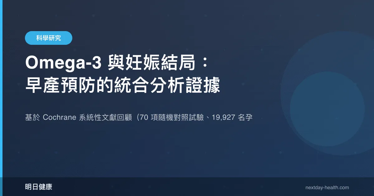 2018 年,Middleton 等人在 Cochrane Database of Systematic Reviews 發表了迄今最大規模的 Omega-3 與妊娠結局統合分析(Middleton et al., 2018, PMID: 30480773)。此系統性文獻回顧納入了 70 項隨機對照試驗(RCTs),涵蓋 19,927 名孕婦,是此領域證據等級最高的文獻之一。