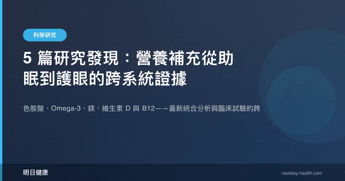 營養補充研究正從單一營養素—單一疾病的線性思維,走向跨系統、多終點的整合分析。2015 至 2026 年間發表的五篇關鍵研究,分別檢驗了色胺酸、Omega-3 脂肪酸、鎂、維生素 D 與維生素 B12 在睡眠、代謝、心血管及眼部健康領域的效果。這些研究採用的方法學涵蓋統合分析、網絡統合分析與隨機對照試驗,為我們描繪出一幅營養素在不同生理系統中的證據地圖。