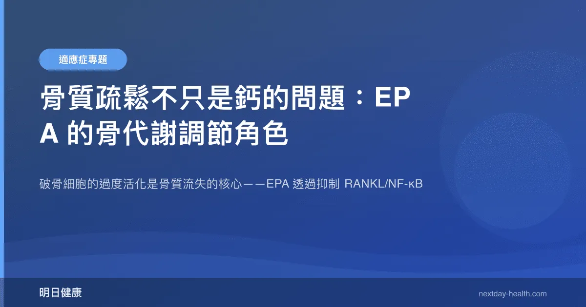EPA 不是塞子——它更像是把排水的速度調慢。真正的「塞子」是處方藥物(如 Denosumab 直接阻斷 RANKL)。但在藥物之外,EPA 的抗發炎支持為骨骼創造了一個更有利的代謝環境。搭配足夠的鈣和維生素 D(建材)以及規律的負重運動(建造信號),你正在為你的骨骼提供最完整的支持系統。