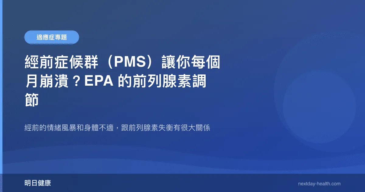 如果你的經前症狀嚴重到影響工作和人際關係,你可能不只是 PMS,而是經前不悅症(PMDD)。PMDD 的情緒症狀更劇烈,可能需要 SSRI 或荷爾蒙治療。EPA 在這種情況下只能當輔助,不能當主角。