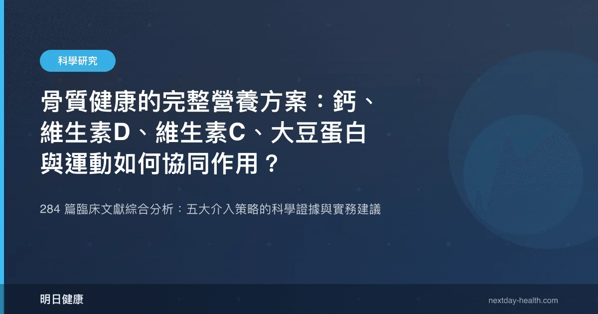 鈣搭配維生素 D 可降低髖骨骨折風險 30%(RR 0.70),加入維生素 C、大豆蛋白與負重運動的五合一方案,透過不同機轉協同保護骨密度,284 篇臨床文獻提供完整科學依據。