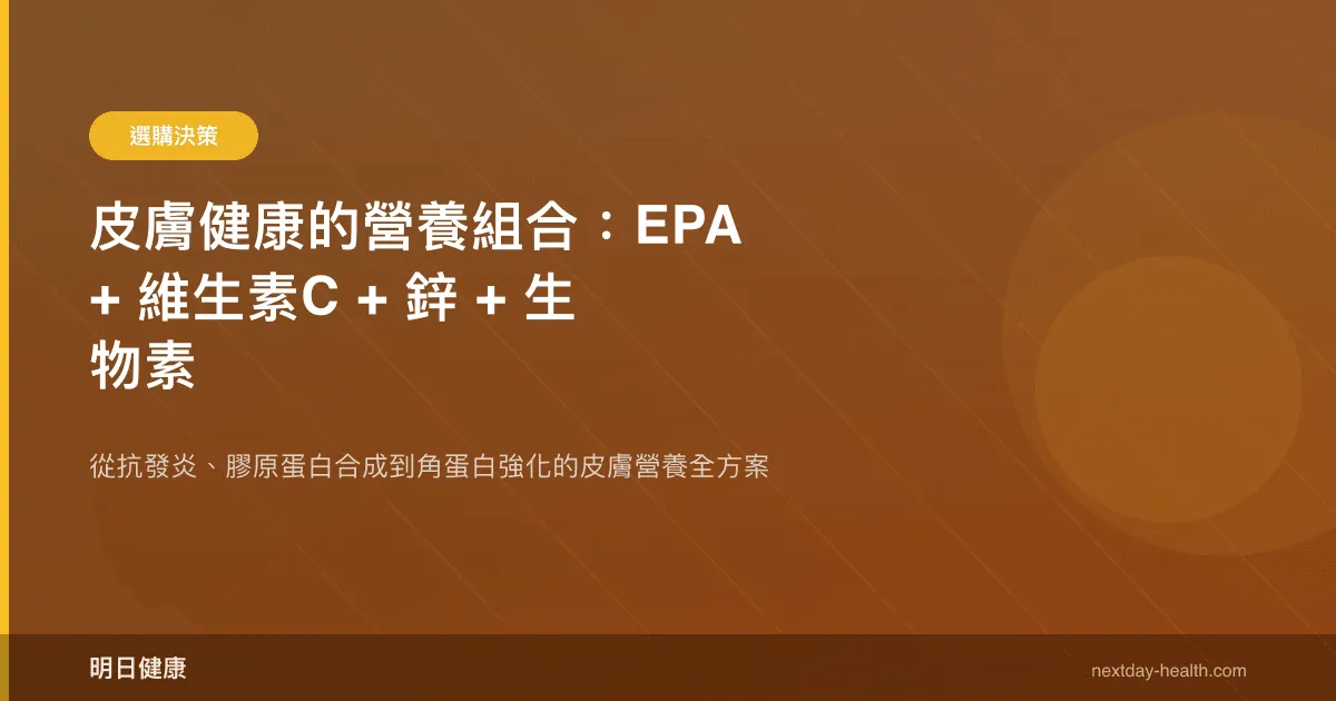 皮膚營養支持的核心邏輯是消炎、合成、修復、強化。EPA 從內部控制發炎並保護皮膚屏障,維生素 C 確保膠原蛋白正常合成並抗氧化,鋅支持皮膚更新與皮脂調節,生物素強化角蛋白結構。根據你的主要皮膚困擾選擇核心組合,耐心觀察——皮膚的更新週期約 28 天,營養介入至少需要 2-3 個週期才能看到明顯變化。