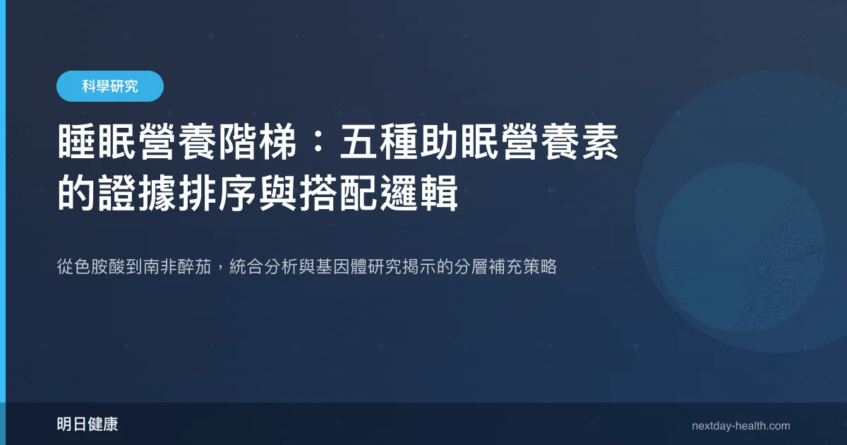 睡眠障礙影響全球約 30% 成年人口,而營養素介入正成為藥物治療外的重要輔助策略。然而,面對色胺酸、茶胺酸、南非醉茄、鎂與 GABA 等選項,多數消費者缺乏「先用什麼、再加什麼」的證據依據。本文彙整 6 篇涵蓋統合分析、隨機對照試驗與大規模基因體研究的文獻,嘗試建構一套以證據等級為排序基礎的營養階梯。