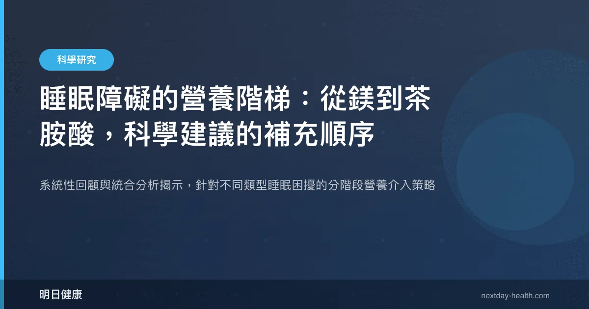 系統性回顧與統合分析顯示,L-茶胺酸、鎂與南非醉茄等營養素在改善睡眠品質方面具有不同的作用機轉與適用情境,透過分階段的「營養階梯」策略,可針對個別睡眠困擾類型選擇最適介入方式。然而,現有證據仍受限於研究間的方法學異質性與樣本量,臨床應用前需謹慎評估個體狀況。本文彙整 15 篇統合分析與系統性回顧的發現,提出一套以證據為基礎的營養補充優先序。