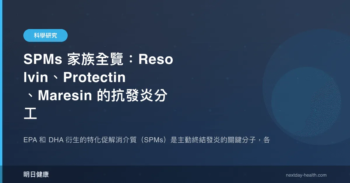 - 早期消退:Resolvin E 和 Resolvin D 系列率先出現,主要功能是「停止招募」——減少中性粒細胞向發炎部位的進一步遷移