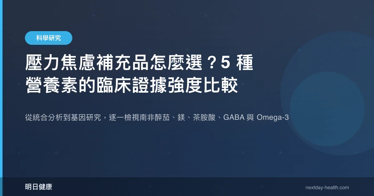 此排名反映的是「針對壓力焦慮管理」的證據強度,而非營養素本身的整體健康價值。鎂與 Omega-3 在各自的核心領域(心血管、代謝)均有堅實證據,只是對焦慮的直接適用性較低。