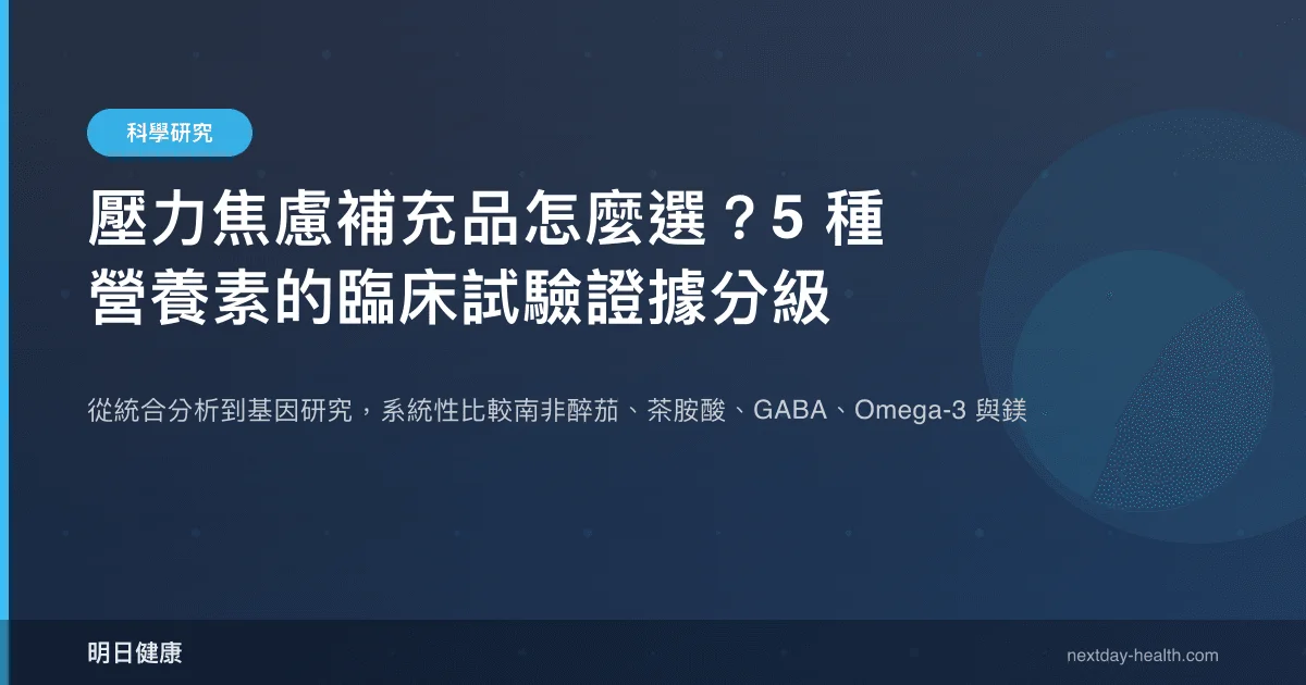 面對壓力與焦慮,營養補充品市場提供了琳瑯滿目的選擇——從南非醉茄到鎂錠,每一種都宣稱能讓你「更放鬆」。然而,這些營養素背後的臨床證據強度差異極大。本文彙整 2022–2026 年間發表的 6 篇關鍵研究,涵蓋統合分析、隨機對照試驗、全基因組關聯研究與前瞻性世代研究,對 5 種常見抗壓營養素進行系統性的證據分級比較。