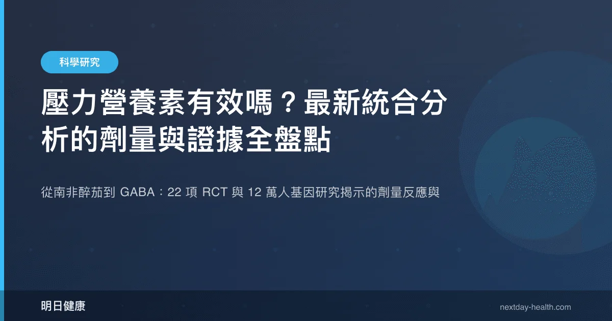 從表中可見,僅南非醉茄擁有直接針對壓力/焦慮的大規模統合分析支持,且具備劑量反應數據。L-Theanine 的睡眠與放鬆證據堅實,但試驗規模較小。GABA 的病理角色獲《Nature Genetics》背書,但口服補充劑的臨床轉譯仍是空白。鎂與 Omega-3 的證據來自間接指標(心血管死亡、兒童代謝),對壓力管理的推論需謹慎外推。