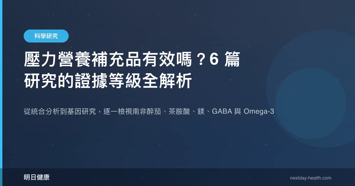 五種常見的「抗壓營養素」——南非醉茄、茶胺酸、GABA、鎂與 Omega-3——在消費市場上經常被並列推薦,但它們背後的科學證據等級差異甚大。本文彙整 6 篇 2022–2026 年的高品質研究,依據研究設計(統合分析 > 隨機對照試驗 > 觀察性研究)與結果直接性,逐一拆解每種營養素的證據強度。