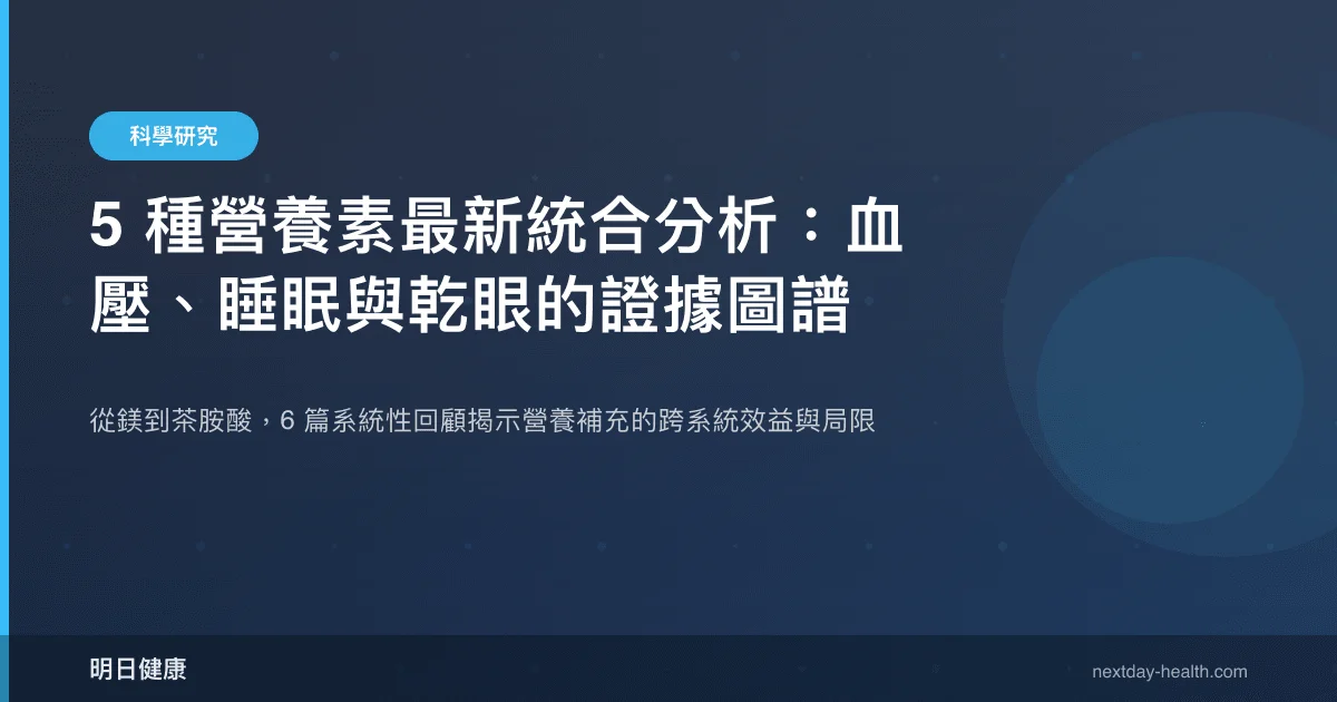 統合分析是指將多項獨立臨床試驗的數據以統計方法合併計算,得出整體效果量的研究方法,被視為證據等級金字塔的最高層。本文聚焦 6 篇 2015–2026 年間發表的系統性回顧與隨機對照試驗,橫跨血壓控制、睡眠品質與眼表健康三大領域,為讀者建構一張以證據等級為座標的營養補充參考地圖。