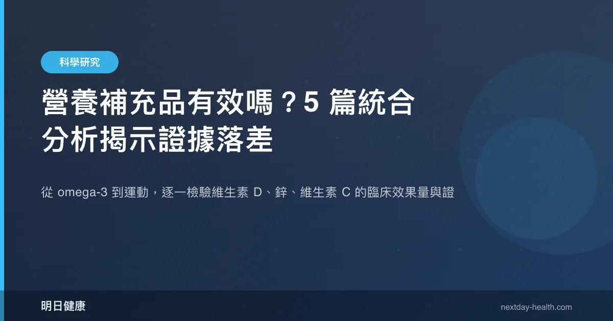 同樣標榜「有益健康」的營養補充品,實際臨床證據的強度差異可達數倍。本文彙整 2023–2026 年間 5 篇高品質統合分析與隨機對照試驗,涵蓋 omega-3、維生素 D、維生素 C、鋅與運動五大介入方式,以實證醫學角度逐一檢驗其效果量(effect size)、證據確信度(certainty of evidence)與研究限制,協助讀者辨識哪些營養策略值得採納、哪些仍需觀望。