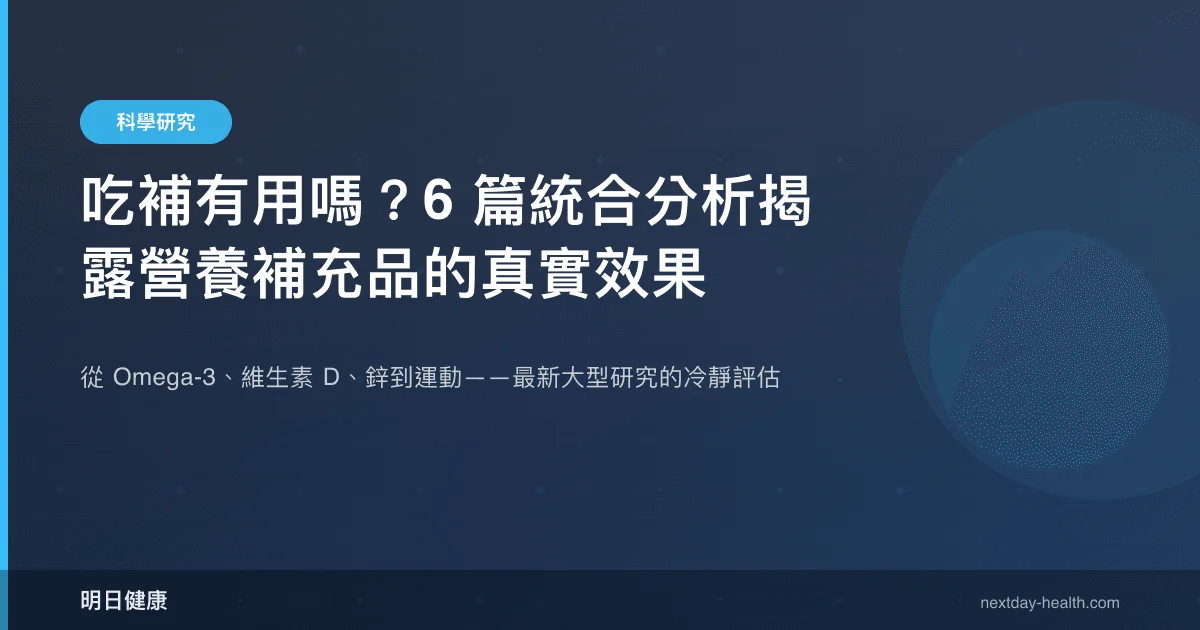 營養補充品市場規模持續擴大,但多數消費者面臨同一個問題:這些產品真的有效嗎?本文彙整 6 篇 2023–2026 年發表的統合分析與隨機對照試驗,涵蓋 Omega-3、維生素 D、鋅、維生素 C 及運動介入,以最高等級的實證醫學證據,為讀者呈現一份不帶濾鏡的效果評估。