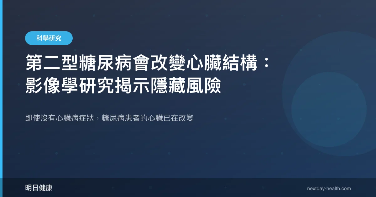一項 2026 年 1 月發表的影像學研究發現,第二型糖尿病會在患者尚未出現任何心臟病症狀之前,就已經造成可測量的心臟結構改變——包括左心室壁增厚、心室質量增加和舒張功能下降。這項發現強化了「糖尿病性心肌病」(diabetic cardiomyopathy)的臨床概念,並提醒醫療團隊和患者:心臟的隱藏風險可能比想像中來得更早。