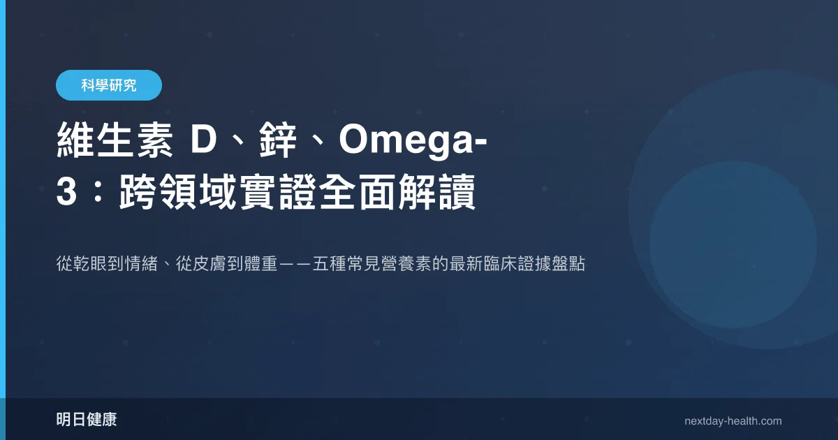 維生素 D、鋅、Omega-3、維生素 C 與規律運動,這五項介入在近年臨床文獻中反覆出現於多個看似無關的疾病領域——從眼科到精神醫學,從兒科體重管理到皮膚老化。這種「跨領域交叉」並非巧合,而是反映了這些營養素參與的生理路徑具有高度多效性(pleiotropic effect)。多效性是指單一營養素或介入同時影響多條生理路徑的特性,例如維生素 D 既調控鈣磷代謝,也參與免疫調節與淚液腺功能。