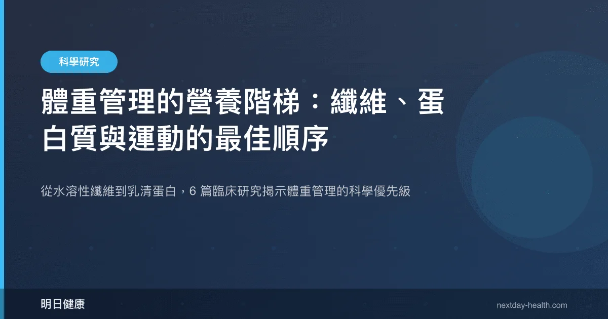 體重管理的核心不只是「少吃多動」,而是在正確的時間點導入正確的營養策略。最新臨床證據顯示,從血糖穩定、蛋白質優化到發炎控制,不同營養素的介入存在明確的優先順序。本文整合 6 篇系統性回顧與隨機對照試驗,為體重管理建構一套以證據為基礎的「營養階梯」。