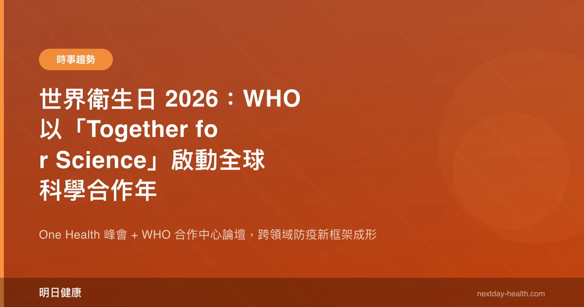 世界衛生組織(WHO)將於 2026 年 4 月 7 日迎來第 78 屆世界衛生日,今年主題定為「Together for Science」(攜手科學),並正式啟動為期一年的全球科學合作運動,呼籲各國加強對科學研究的投資,以應對未來健康挑戰。
