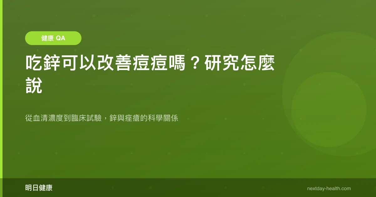 可以,但效果因人而異,也不是每種痘痘都一樣有用。根據 2020 年發表的系統回顧與統合分析,容易長痘的人確實比一般人血清鋅濃度更低,補充後發炎性丘疹也有統計上的改善。