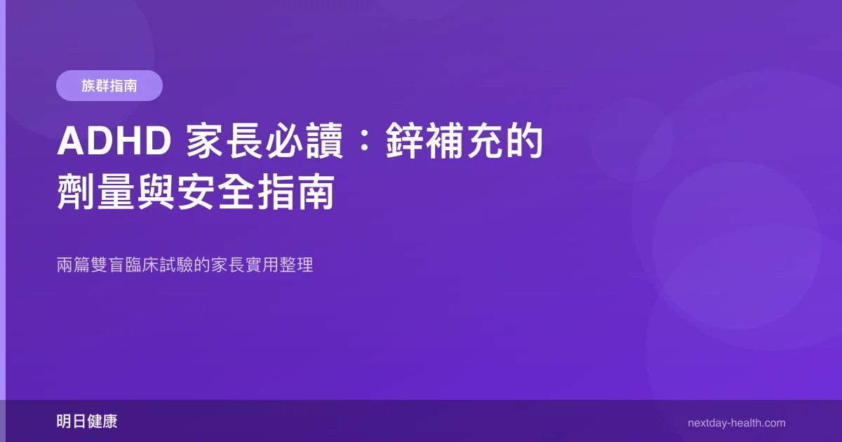 - 每天補充約 34 mg 元素鋅,可顯著改善 ADHD 兒童的過動與衝動症狀(400 人雙盲 RCT,PMID: 14687872)。