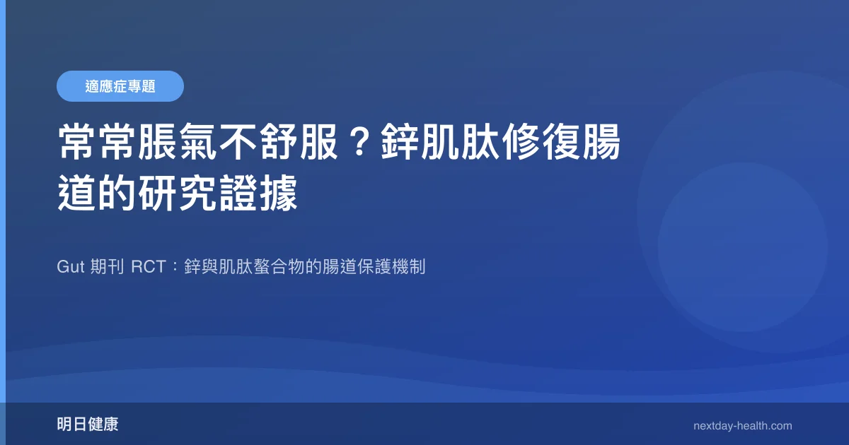 - 鋅肌肽(Zinc carnosine)可將非類固醇消炎藥誘導的腸道通透性升高幅度縮小約 3 倍,人體 RCT 確認(Gut 期刊,PMID: 16777920)。